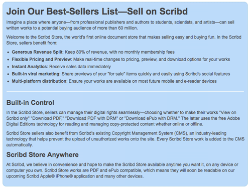 Scribd — the most unpronounceable branding since gdgt.com — wants to encrypt your eBook and sell it for you — and for that favor they’ll take a 20% consignment fee for their role in the life of your book.