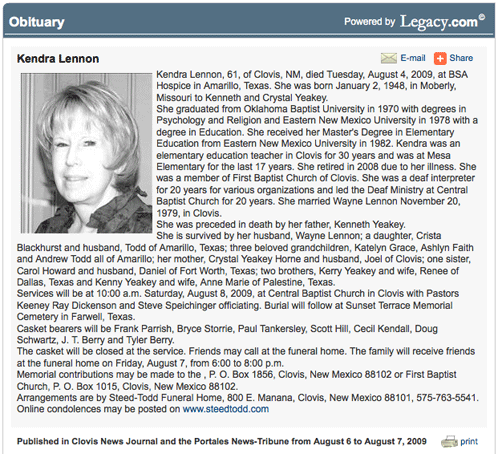 Here is the online obituary for Kendra: